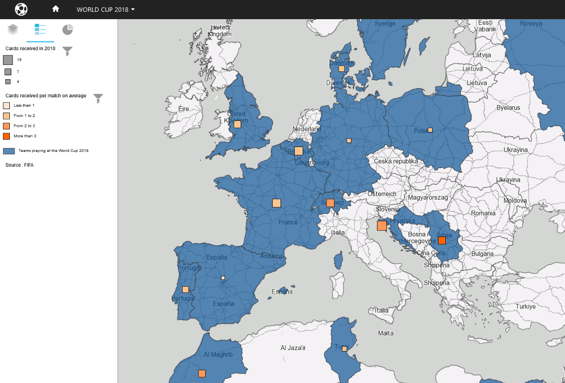 At the top of the atlas, you can choose between the 2018 World Cup and the total figures of World Cups since 1930.